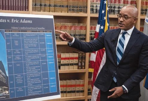 ◗ In February 2023, getting the city’s Department of Buildings to lift a stop-work order to bene t a construction company owner who had solicited straw donations to Adams’ campaign.