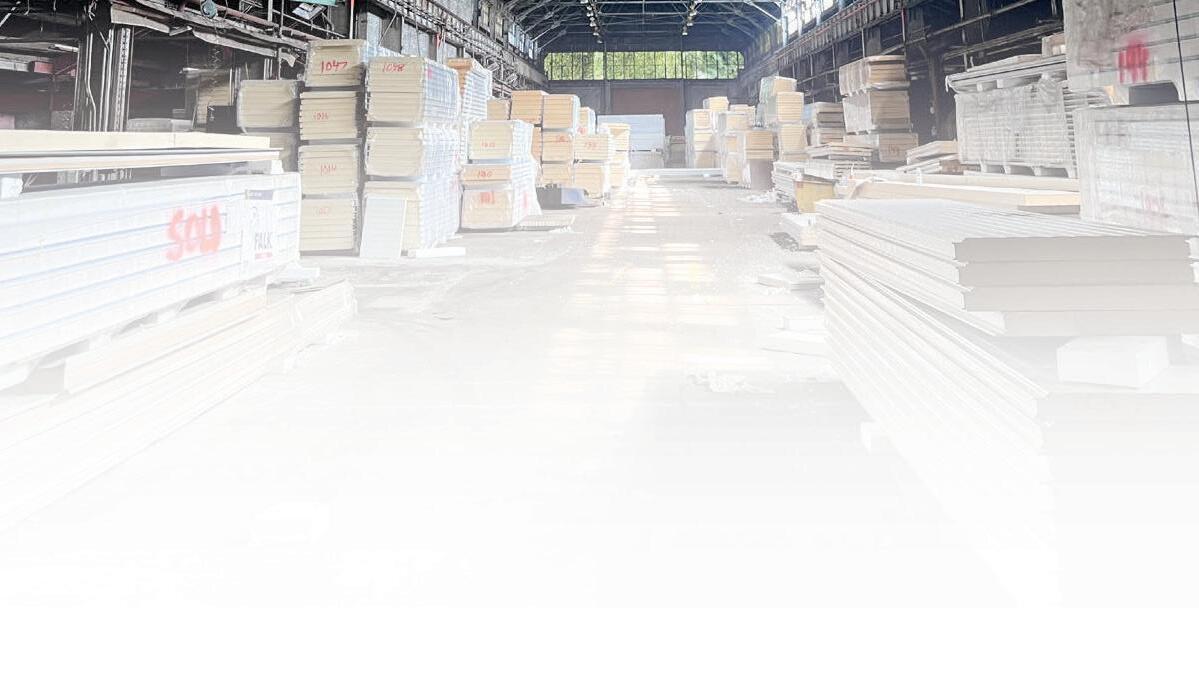 Packy Hyland holds a cutaway sample showing layers of insulation, steel framing and steel siding.