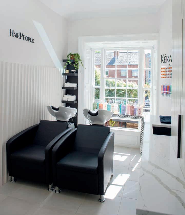 TV presenter Jennifer Zamparelli and her long-time hairdresser Bernadette Byrnes, formerly of Oslo in Ranelagh, have opened HairPeople in a Georgian building on Dublin’s Adelaide Road. Bernadette is quick to credit interior designer Vilma Mocke with the beauty of this very feminine space, but the founders’ in uence is clear, from the bookcase of biographies to the helpyourself coffee bar and the stay-and-chat velvet window seat. “I wanted a boutique salon; a place people would feel embraced when they come in and not rushed to leave when we’re done. The marble stations have curved mirrors with warm lighting and quilted leather chairs,” says Bernadette. “The artwork is very special to me. I love Frida Kahlo, who is up there, and one of our senior stylists, Leonardo, has a painting up too. A client who is an artist has a piece on our wall as well. I came up in the kind of community-vibe salon where everyone knows your name and that’s what I want to run.”