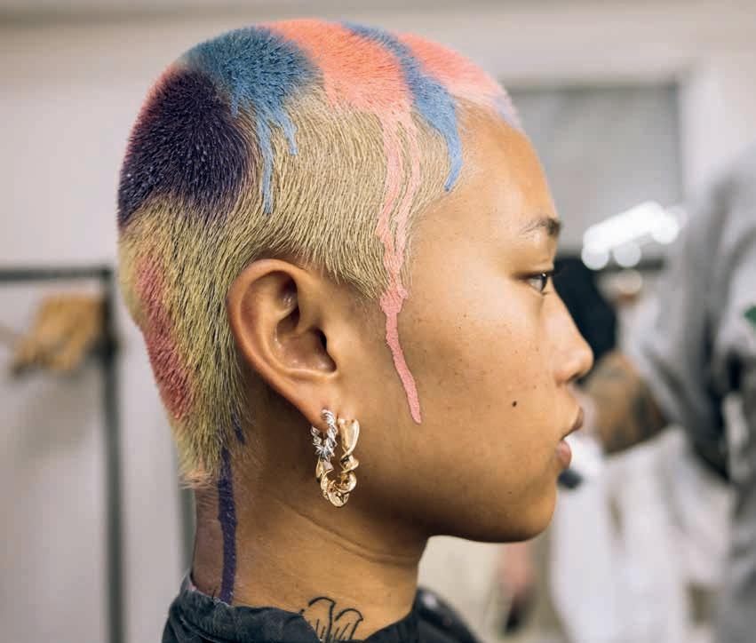 “Slow and low, as well you know, bleaching these buzz cuts. We really want the colours to pop. Some freehand animal print, leopard in pinks, greens, purples, then black to make most of those dots pop. I love doing freehand animal print. I always make sure, every time I’ve done it, it’s been a different variation of colours. I’m excited about the idea of stencilling too, with a little wink to BaByliss PRO, cutting it down to ‘Bliss’, because I just like how that looks and sounds.
