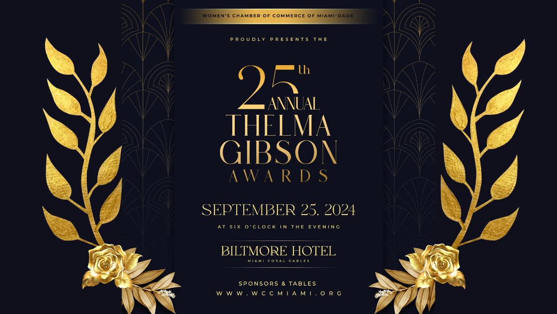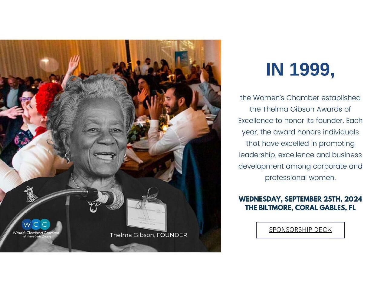 Tonight, wehonor thelegacy of ThelmaGibson, atrailblazer who paved theway for countlesswomen to riseand thrivein their chosen fields Her commitment to upliftingour community and empowering women continuesto inspireall of usat theWomen'sChamber of Commerceof Miami-DadeCounty