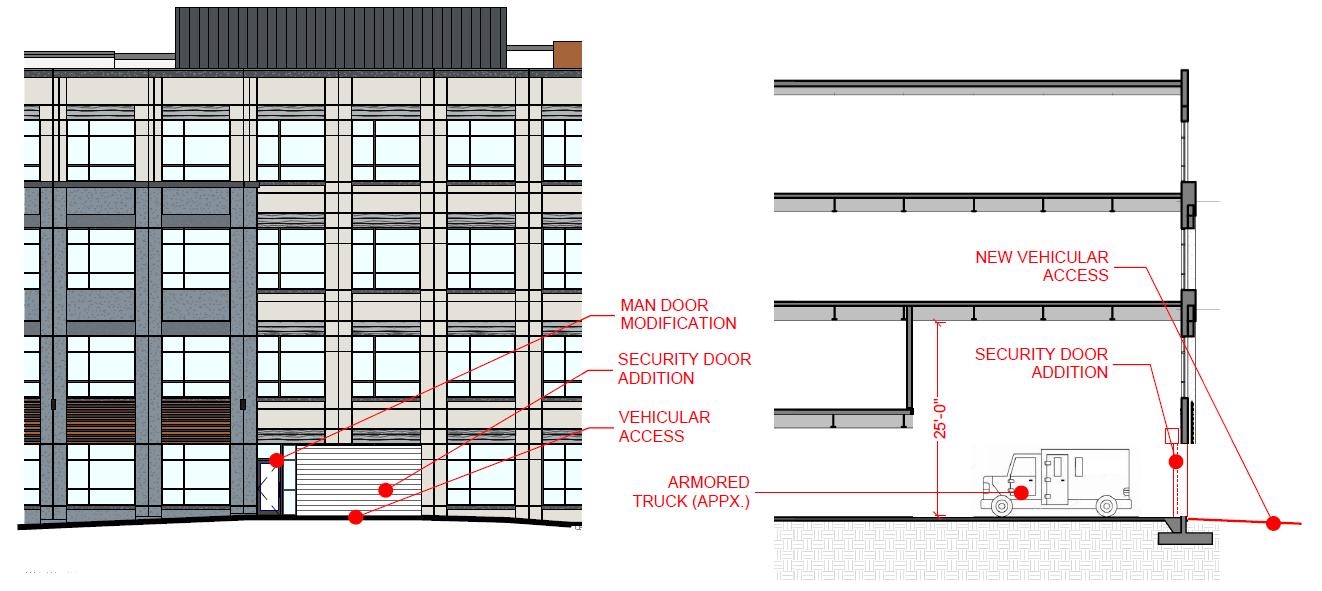 • Capacity to provide vehicular drive aisle access on the ground floor as expanded service access