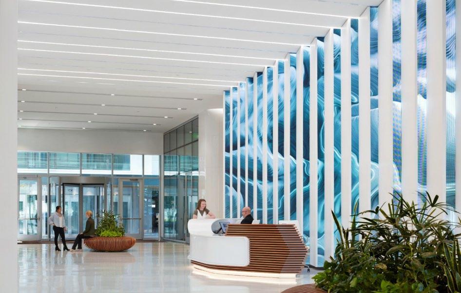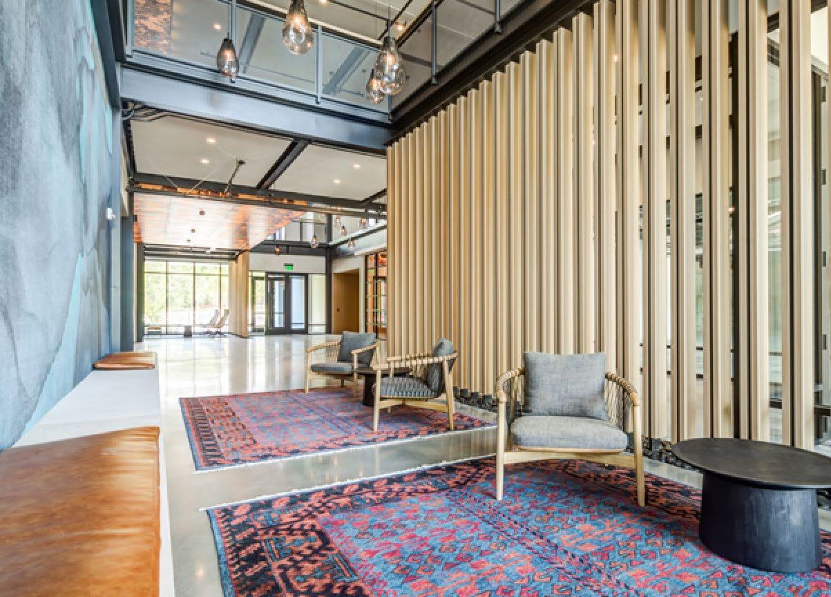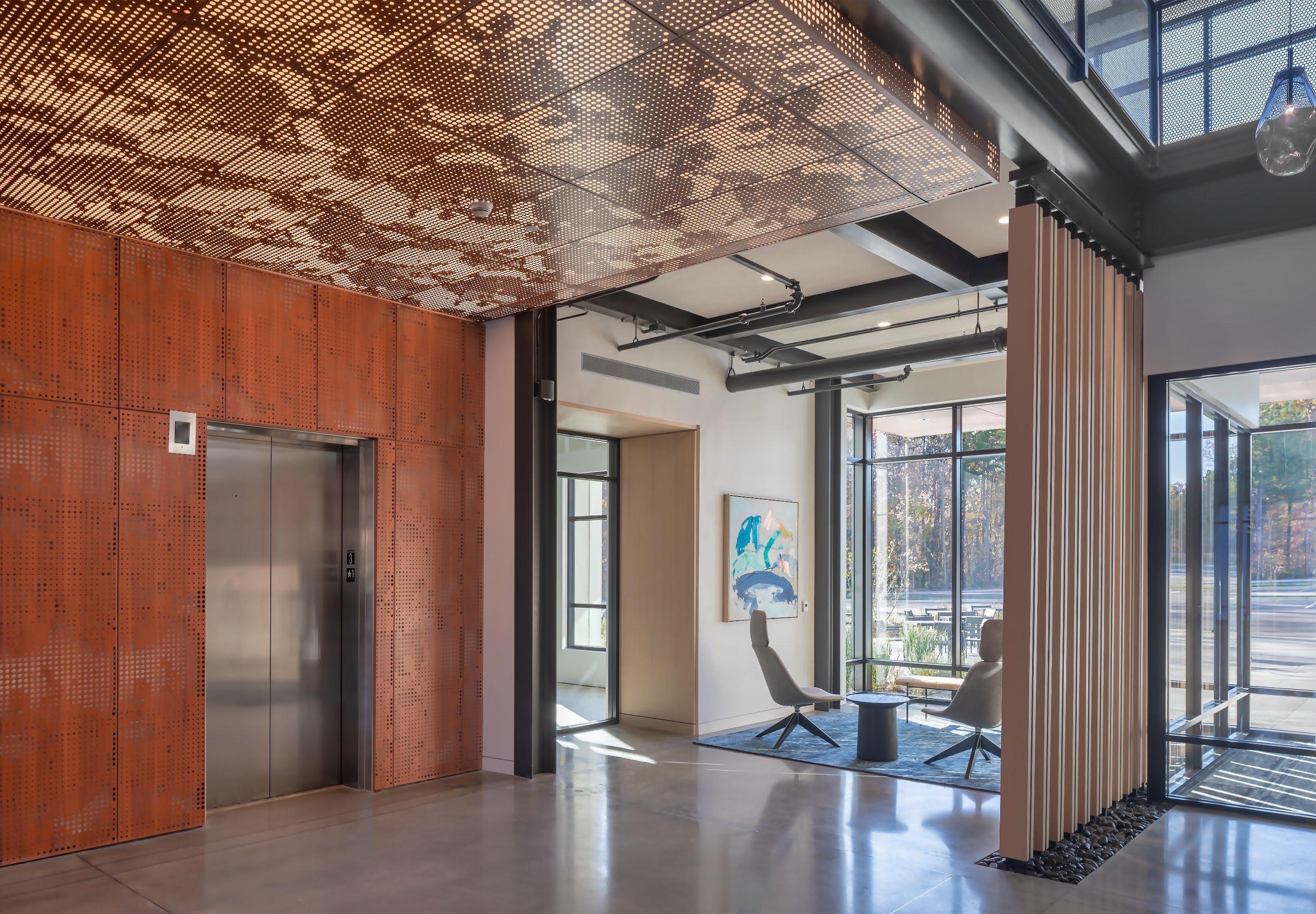 • Building Lobby Finishes: Polished concrete floors, gypsum walls with painted steel, stained wood, and perforated steel accents