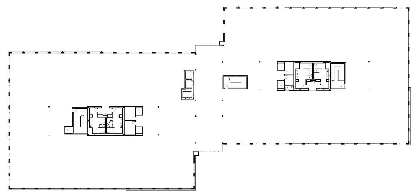 • HVAC: Package system with 7 units mounted on roof. Medium pressure duct around the core, with branch lines for future tenant