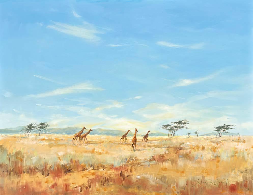 Julia’s real artistic journey began in Kenya. In her early 20s, she left behind a career in advertising and PR to work with the Maasai in the heart of Kenya’s Rift Valley. Immersed in the rhythms, colours and light of Africa, she found lasting inspiration – not only in the wildlife and people, but the landscape too. These experiences continue to form the foundation of her work.
