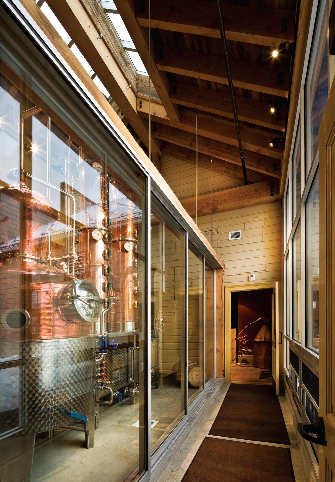The Ellsworth Beggs house and the adjacent Watts Ga rage, listed on the National Register of Historic Places in 1984, is now the home of High West Distillery. The buil dings were renovated and house the distillery operations, a restaurant, a tasting room, and a saloon. A new struc tural frame was built on a new footing and foundation, and now supports the structural loads and provides a weatherproof enclosure. This approach allowed the exis ting fabric of this fragile building to maintain its historic integrity while it was brought up to code for its new use. The house was moved on-site while a new concrete foun dation and basement were constructed, and then moved back onto its new foundation. The main level contains a tasting room, reception area, and bar for the restaurant. The upper level has office space and a dining area for the restaurant. A new link connecting the house and garage houses the stills for the distillery and contains storefront windows on the street-facing façade.