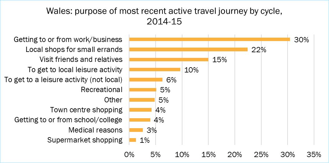 • Respondents aged 16+ in Wales are asked if they’d cycled in the last three months as a “means of transport” , defined as cycling to get to a particular destination such as work, shops or to visit friends, but not cycling purely for pleasure or exercise