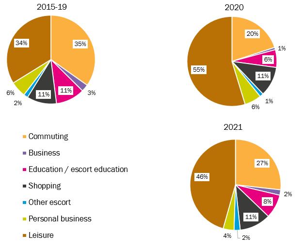 • On average a year from 2015-19, people made 960 trips by ‘all modes’ (i.e. car, cycle, public transport, foot etc.). This dropped to 739 in 2020 (-23%), and 757 in 2021 (-21%)