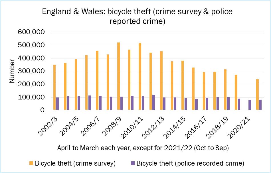 • Best estimates suggest that about 19,000 bicycle theft crimes were committed in 2019/20, affecting approximately 0.7% of households. (Note: this comes from a crime survey, not police records).