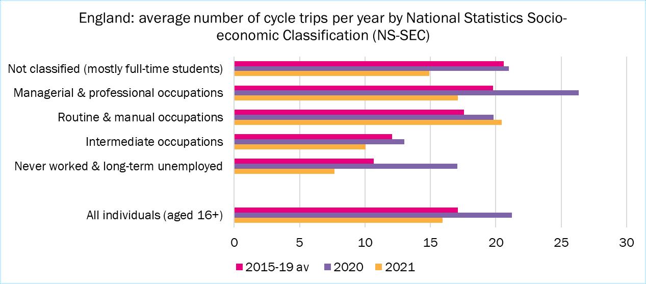 • The average length of a cycle trip rose from 3.3 miles in 2015-19, to 4.1 miles in 2020, dropping in 2021 to 3.6. In contrast, the average length of a car/van trip as a driver dropped from 8.4 miles to 7.9 in 2020, and to 7.4 in 2021. (NTS 0303)