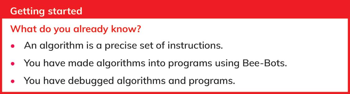 1 First, write an algorithm for each challenge. Then read this aloud to your partner. This will help you to spot any bugs. Your partner can also use a paper Bee-Bot to help you test your algorithm.