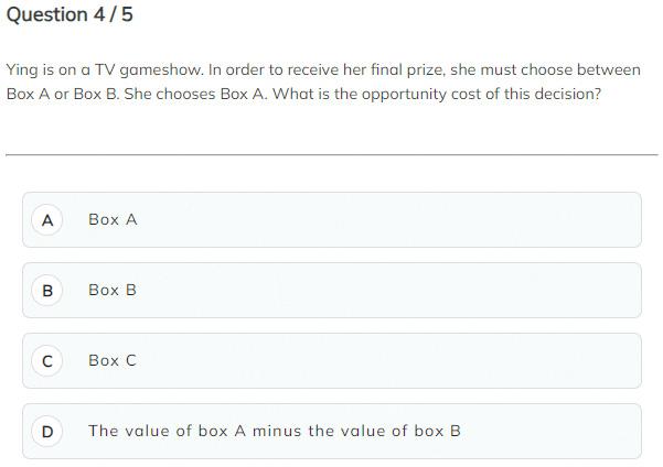 These ask you to select the correct answer to a question from four options. These are auto-marked and feedback is provided.