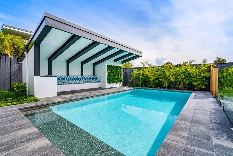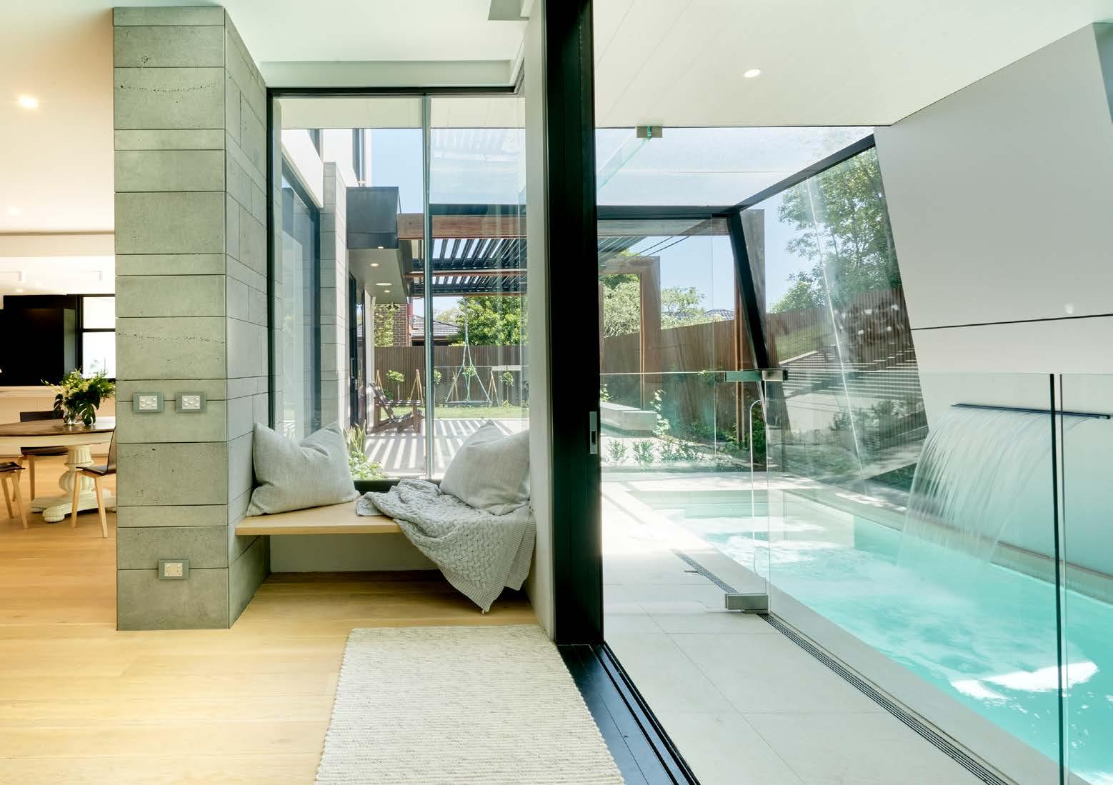 illusion of it floating at the centre of the property. Stepping stones across the water provide access to a separate cabana, with soaring timber lined ceiling, a spa and the stunning glass front lap pool that sits at the waters edge.