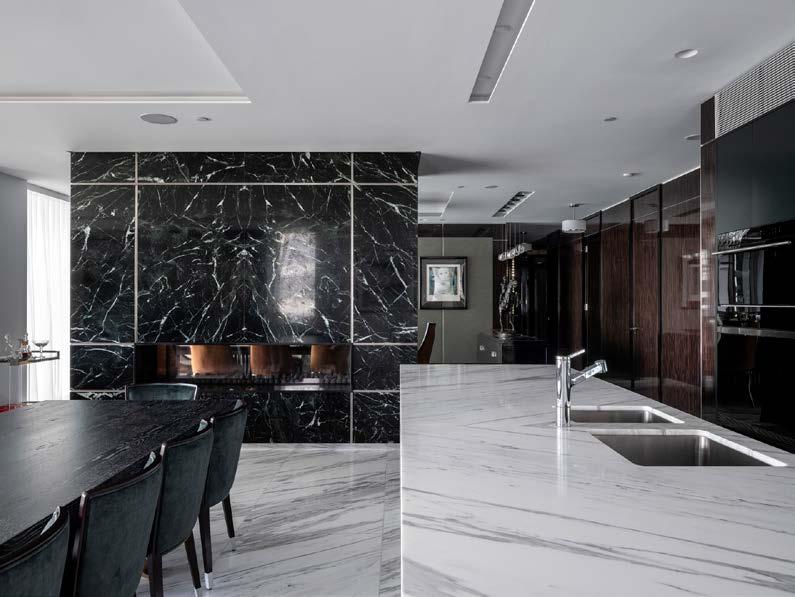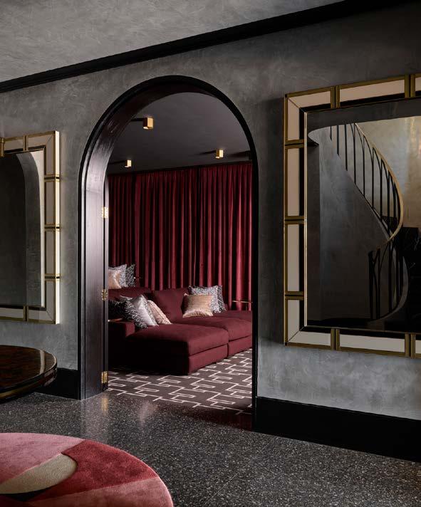 In response to the owners’ request for a predominantly dark palette, Natale masterfully employs luxurious Nero Marquina marble floors, featuring striking black expanses or geometric patterns paired with white marble. Arches grace the hallways, walls, doors, windows, and shelving, creating a harmonious flow and accentuating the graceful silhouette of bold furnishings. This layered approach, combining classic influences with contemporary luxury, combines to create the home’s sumptuous aesthetic.
