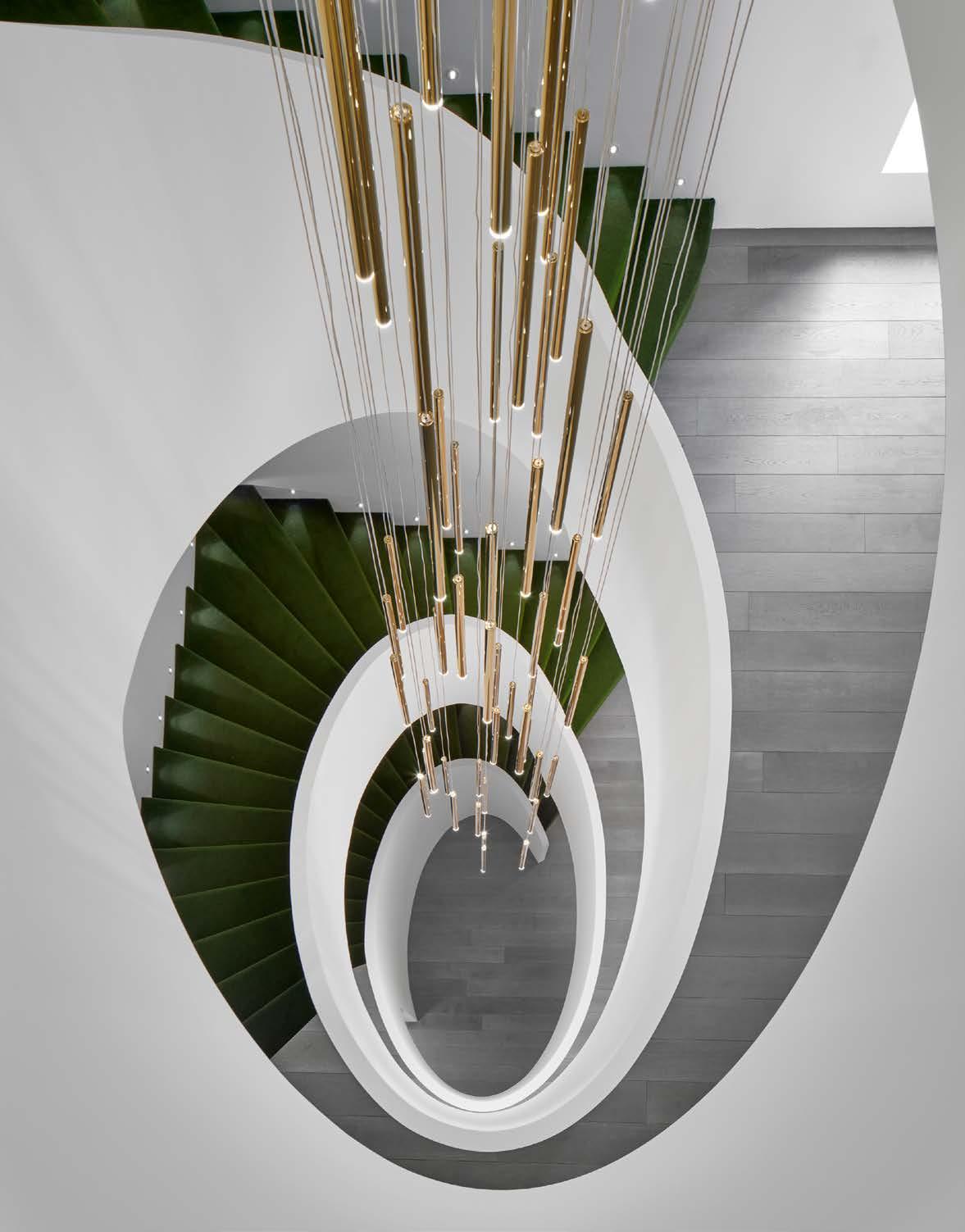 The grandeur of the staircase takes center stage, as colossal black slabs of marble evoke the spirit of grand Italian spaces whilst arches unfold above in all their magnificence, painted in gray velvety stucco, directing attention to their classical lines and providing tantalizing glimpses of adjoining rooms. A contemporary pendant light descending through the staircase’s void adds to the brass accents that are found throughout the residence.