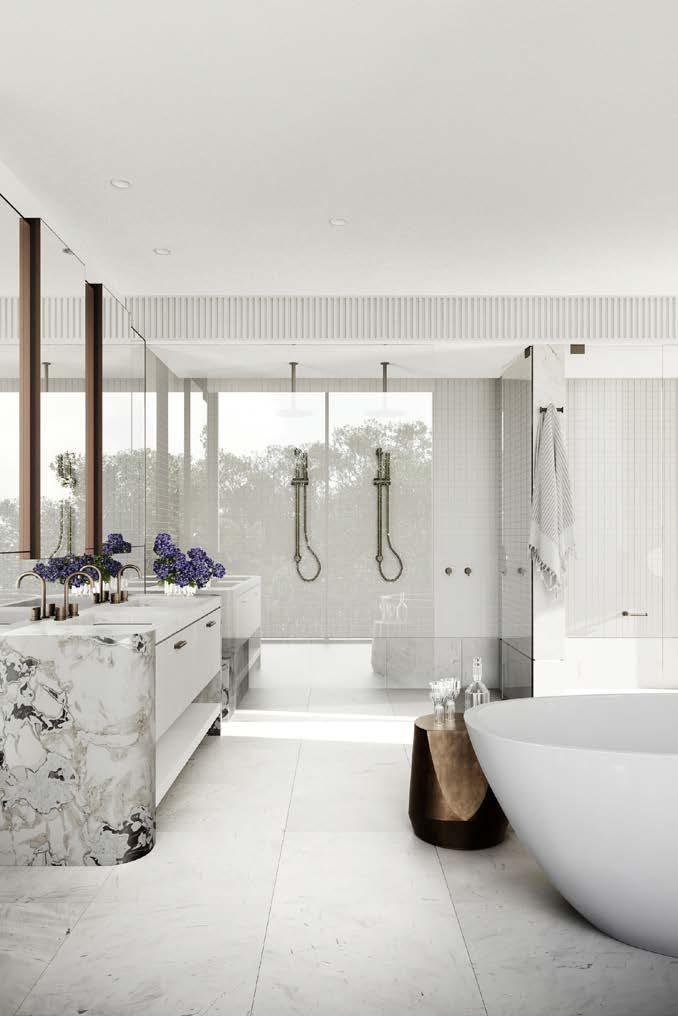 The kitchen, dining and living space opens seamlessly through walls of sliding glass onto the generously sized terrace, combined they create an expansive space for entertaining guests in style whilst taking in the spectacular harbour vistas. A second dining space separated by a double-sided gas fireplace set in a spectacular marble clad wall, provides the perfect space for elegant formal dinner parties. Featuring curved marble walls with feature lighting, a fluted freestanding bathtub, and a stunning mosaic floor the luxurious bathroom provides the ultimate space to relax and rejuvenate.