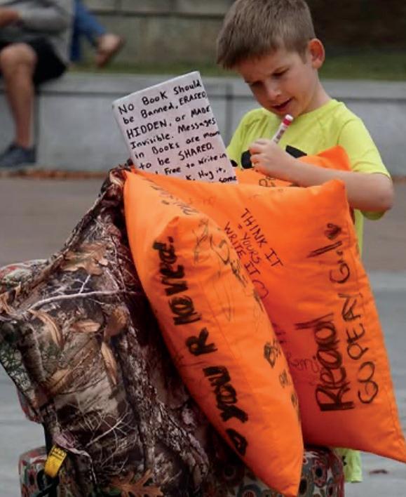“Everyone is affected by book bans,” Collins said. “This is a civic act we’re doing. We’re all taking on new roles and new skills. A lot of people are trying stuff out,” Collins said of the variety of artistic styles and mediums in the final project. Collins made twenty massive blank books, and some of the teams made their own books out of other materials or that were different sizes. For most of the books, local writers and artists collaborated to make a statement together. Individual artists also created books as well.