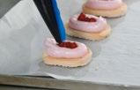 20 將覆盆奶油餡、覆盆莓果餡分別放入擠花袋。取杏仁蛋白餅, 沿著餅皮繞圈擠入覆盆奶油餡,中央填入覆盆莓果醬。