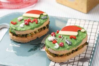 白巧克力隔水加熱,加入綠色食用色素。取 杏仁蛋白餅,正面朝下沾取覆綠色巧克力 醬,冷藏定型後,再貼上可食用裝飾糖、切 片糖等裝飾。