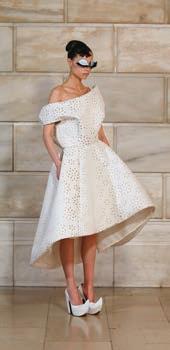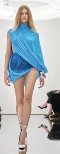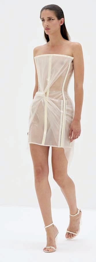 fashioned a tribute to female athletes, calling upon Greek goddesses. Abundant draping revisited the original Olympic Games of ancient times in a clean palette of black, white, and gold, graceful waterfall-esque dresses and bodysuits with visible boning were accessorized simply with flat knee-high gladiator sandals.