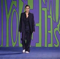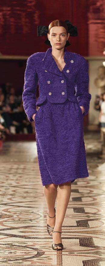 The collection befitted the theatrical setting, with gowns or cape-topped bodysuits and tap pants, trimmed with feminine details (more bows!) and balletic touches (tulle skirting, pale pinks), plus the maison’s trademark tweeds as skirt suits and structured sheathes, striking in regal purple and muted gold hues.