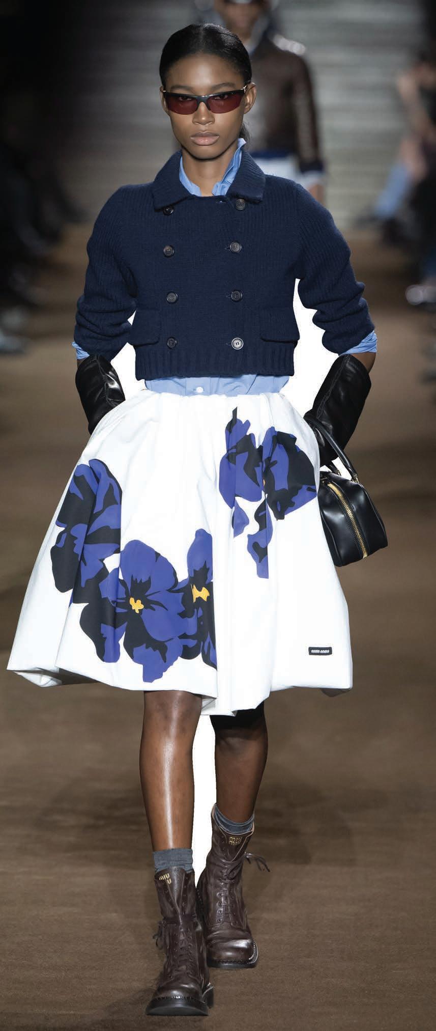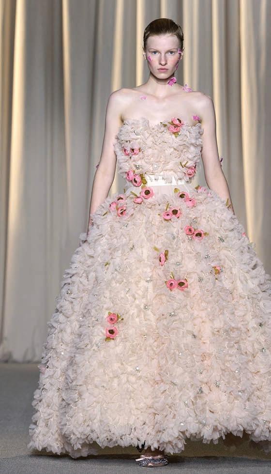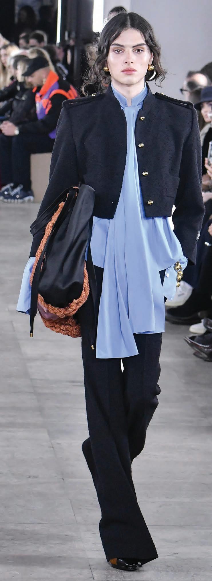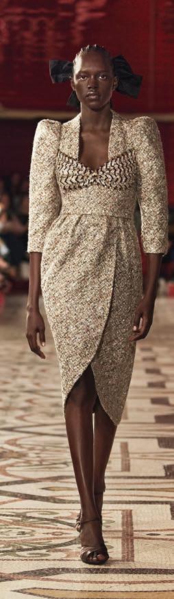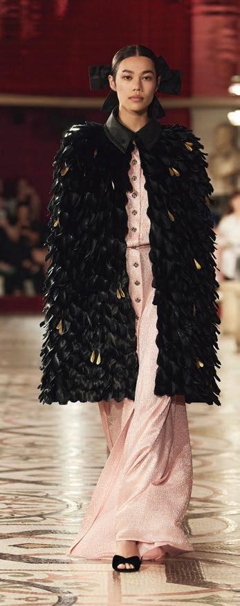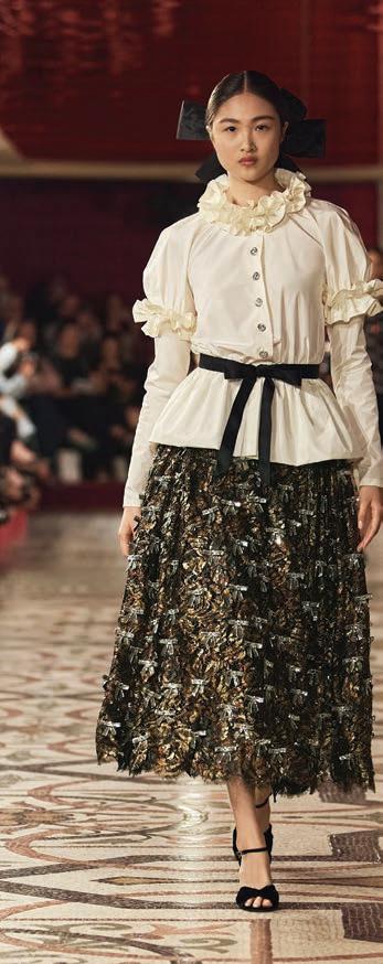 Chanel brought the drama to Opera Palais Garnier, walls bedecked in velvet to re-create elegant theater boxes; sans creative director, the collection was conceived by the atelier’s 150 artisans. Face-framing ruffled necklines and crisp collars emphasized the oversize black hair bow, a styling signature throughout the collection, along with pearlheeled satin peep-toed Mary Janes.