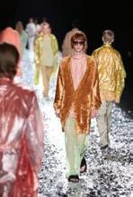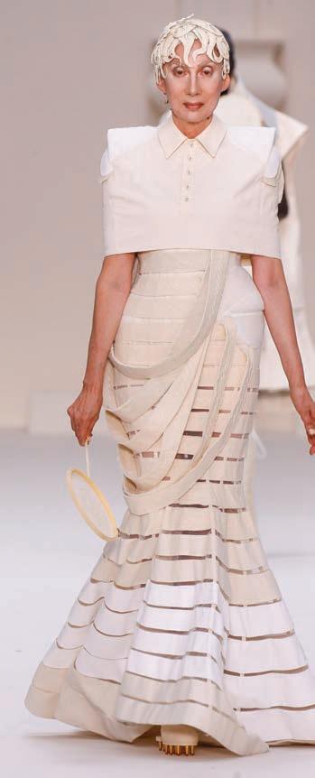 The collection kicked off with camel, black, white, and tan and introduced silks in nuanced shades like those Marco Polo might have brought back from Cathay or Constantinople. There were gowns for special occasions and also snappy tunics, sharply cut tailleurs, and neat all-in-ones with everyday elegance ready for travel and adventure. Outsize tassels, chunky drawstrings, extravagant handkerchief cuffs, and velvet pannier skirts were key features. The crowning glory was a series of turban-inspired headpieces, in collaboration with legendary British milliner Stephen Jones.