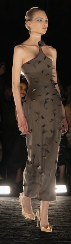 It was all about the 1930s at Giorgio Armani Privé’s Palais de Tokyo show. Fitted sharpshouldered blazers, wide metallic trousers, and copious berets ruled the runway. The silhouettes were clean, the cuts precise, and the palette sophisticated. Fluid textures of silk, organza, and tulle got sharpened by black velvet trim and were accented with handmade embroideries, rhinestone-embroidered metallic mesh, and sequins that read as chic shimmer, not showgirl sparkle. The show ended with the entire troupe of models strolling the runway to Glenn Miller’s “Moonlight Serenade,” while Mr. Armani made his final salute hand-in-hand with a duo of gilded gown-clad models. FRONT ROW