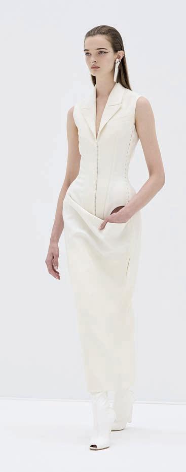 Exquisite corseted silhouettes, sheer draping, and hook-and-eye fasteners defined Courrège’s Nicolas Di Felice guest-designed Jean Paul Gaultier couture show, trimmed with giant standing collars and minimal accessories. Eschewing prints or bright colors that JPG is best known for, Di Felice sought to explore more underrated, less-obvious elements of the designer’s legacy— successfully so, it seems, as the collection received high praise from Gaultier himself.