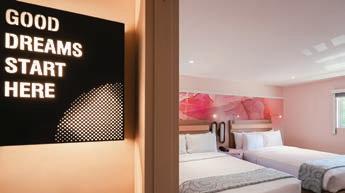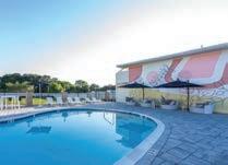 You enter through a separate hallway, which connects to two rooms. Our spacious suites are more like an apartment! You’ll have a refrigerator, microwave, table and chairs, pull-out sofas, computer desks, TVs, a living room, a bedroom, and a balcony or patio. The bathrooms even have two vanities! We’ve been told it’s everyone’s happy place. The pool is fab. What do folks need to know? The pool also has a refreshment truck filled with iced lemonade. The area leads onto a beautiful, huge green lawn. We’re going for a modern country club–like vibe!