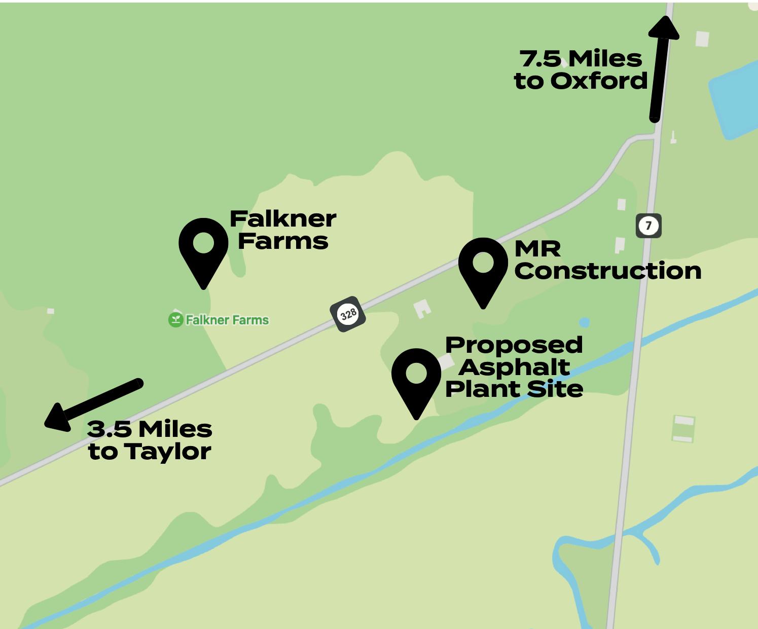 Local developer JW McCurdy wants to build a hot mix asphalt plant eight miles south of Oxford and three miles east of Taylor, Miss. He is facing one big hurdle — the proposed site for the facility must be rezoned from A-1 Rural to I-2 Heavy Industrial to move forward with construction. The owners of Falkner Farms across the highway believe they will face significant loss-