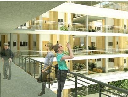 The corridor leading to residents studio unit are designed so it provides friendly and lively noninstitutional-like environment that encourage interaction between residents
