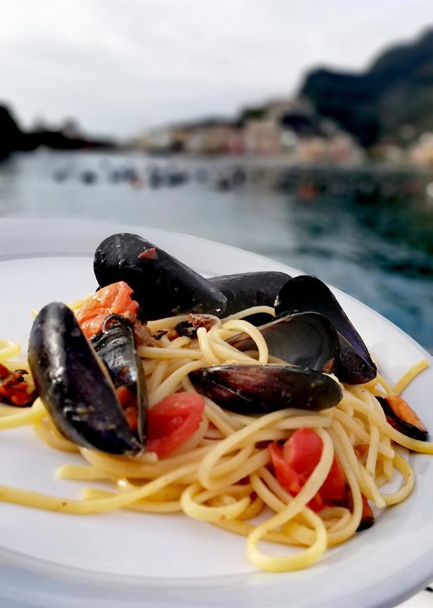 de pain ou de fougace avec tomates, filets d’anchois au sel et à l’ail qu’on peut manger aussi bien en été, si le jour que le soir, garni avec des cornichons pour un dîner rapide. Dans le Village il y a aussi beaucoup des restaurants , et bed&breakfast à condution familial, consacrés au slowfood et très pas chers. Trenette, trofie, soupes aux céréales, tagliatelle et risotto au fruits de mer, se trouvent dans le menus de commandes de tous les restaurants, mais le grand protagoniste c’est toujours le poisson à manger : à préférer anchois marinés, ou farcies, et les moules, cuit dans chaque variante possible, accompagnés aussi par les vin Vermentino DOC des colles de Luni ou par les Vins Réserves des 5 Terres. Les huitres du Golfe des Poètes sont élevées en suspension et ont une couleur verte caractéristique donnée par la présence abondante de phytoplancton qui amène de la saveur et du goût. C’est une huitre qui, vivant dans une mer plus salée par rapport à l’atlantique, est beaucoup plus goûteuse. De plus, étant stérile, elle a la particularité de ne pas devenir laiteuse durant la période estivale contrairement aux huitres provenant d’autres zones européennes, et elle est ainsi consommable toute l’année. En concluant le dessert préférés sont les fruits frais de saison, et, pour les grands connaisseurs, les sorbets aux citron, fruit typique de la région.