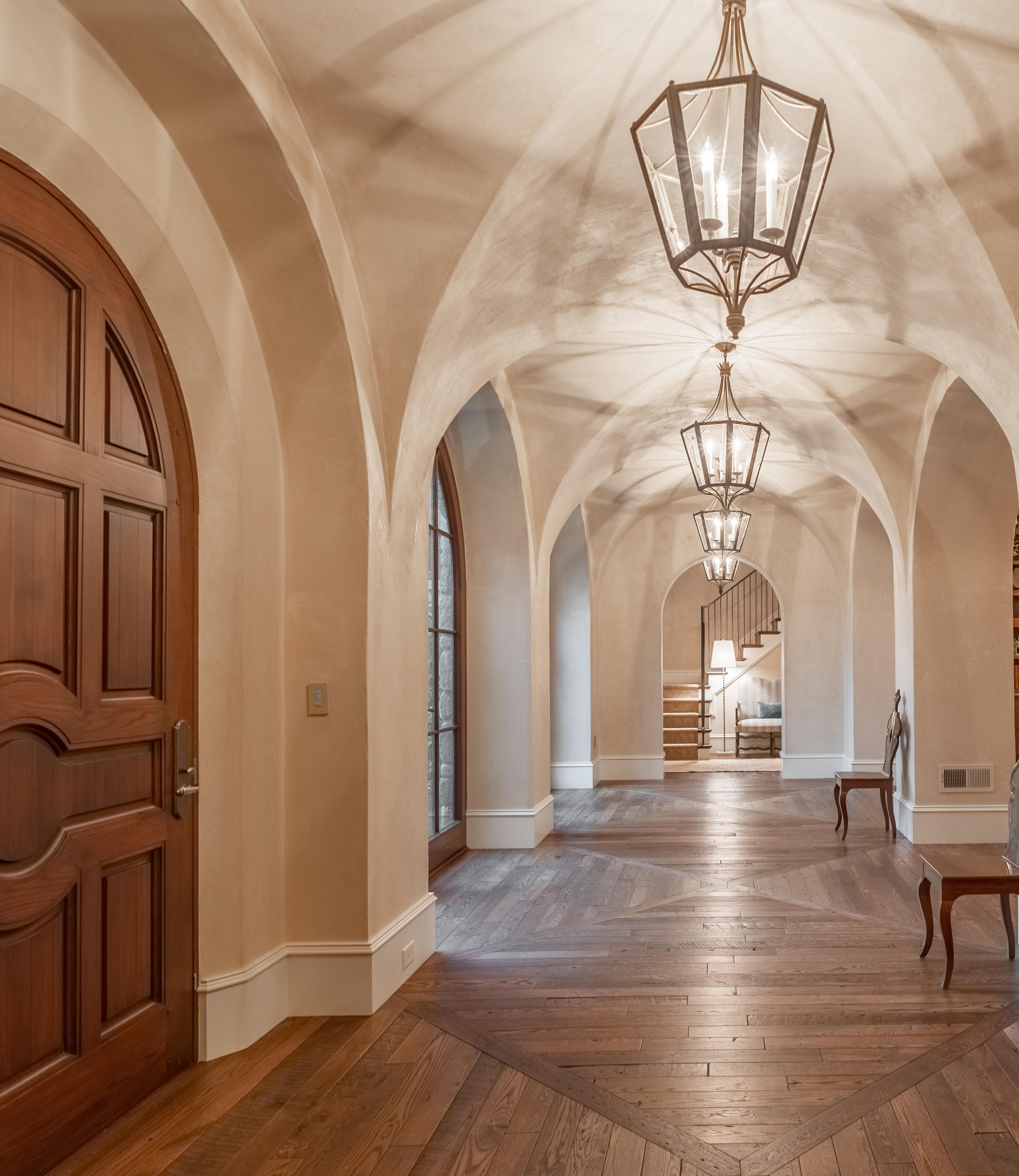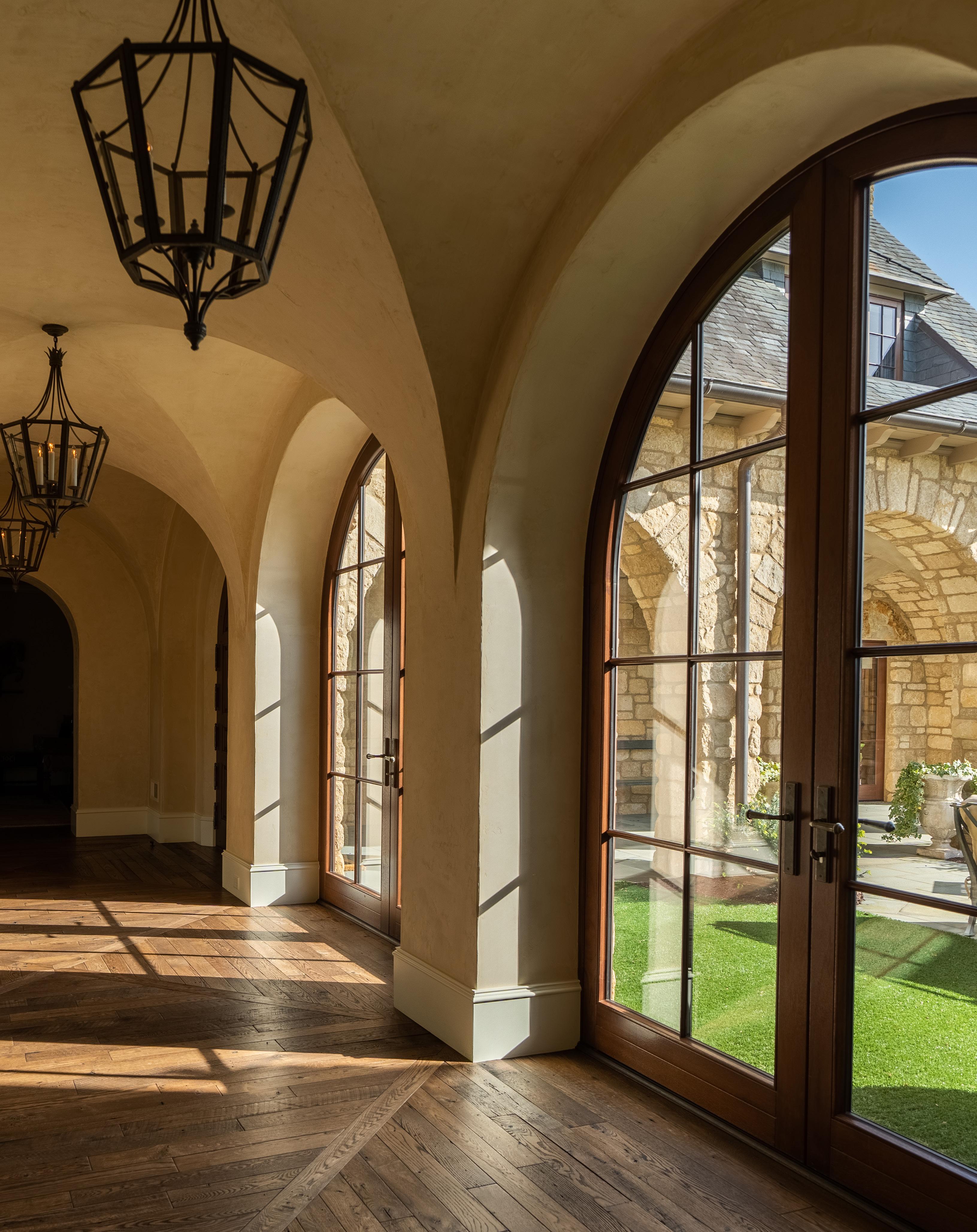 • Barrel Groin Ceilings in Foyer with Arched French Doors to Courtyard