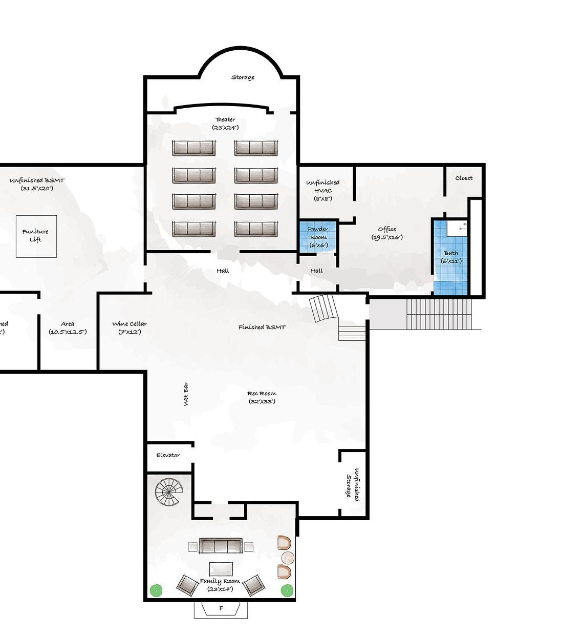 The home’s lower level evokes the feeling of an Old World European pub, featuring reclaimed wooden beams from barns across Kentucky, leather furniture and a temperature-controlled wine cellar. A large state of the art theater also resides on the lower level.