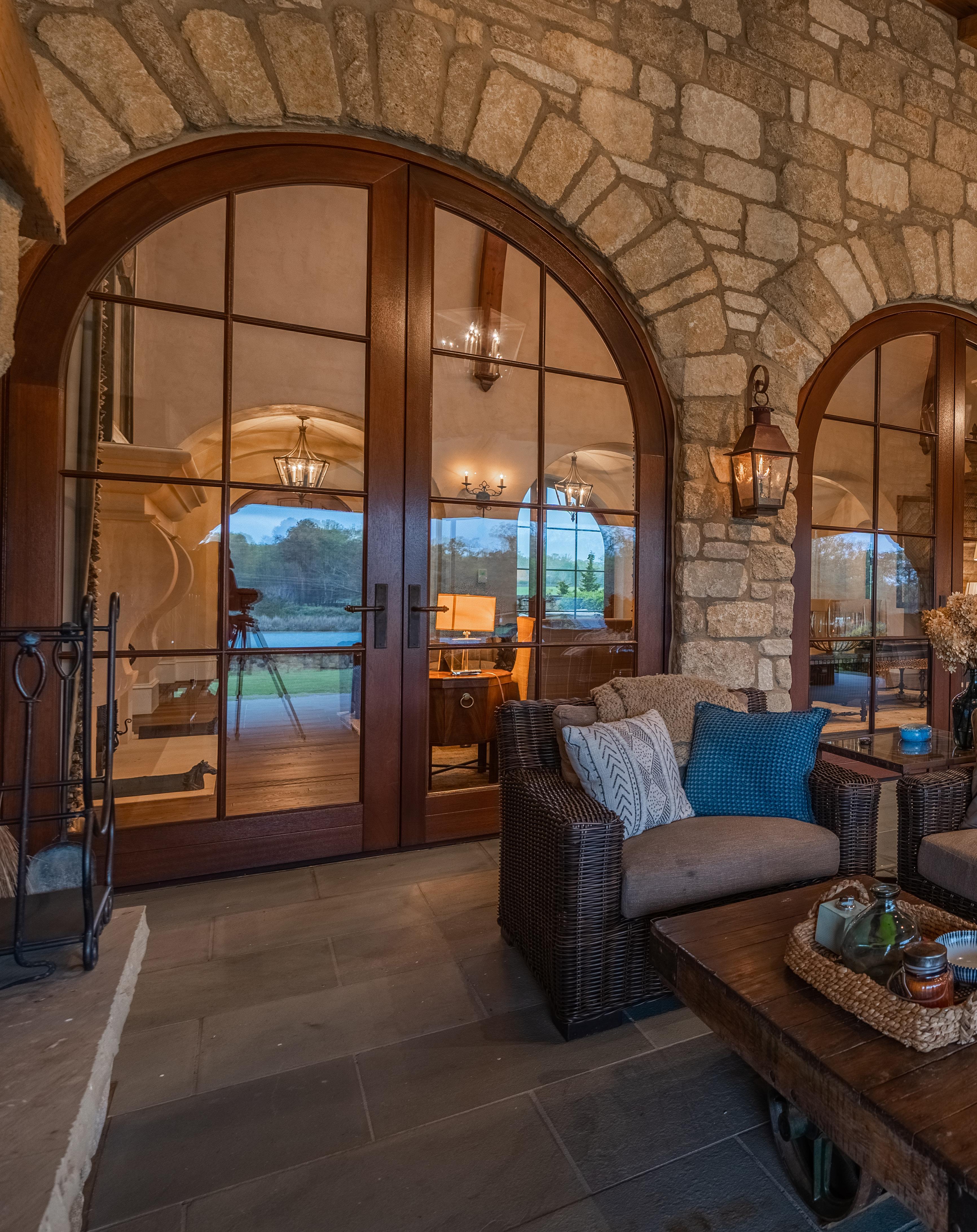 The den is a work of art in its own right. It features soaring 25 foot ceilings with reclaimed beams from a Louisiana Mill. The focal point is another of the homes many impressive stone fireplaces, flanked with floor to ceiling windows that bring in views of the pool terrace and pastures. The stone mantel, along with the beams were assembled using a crane.