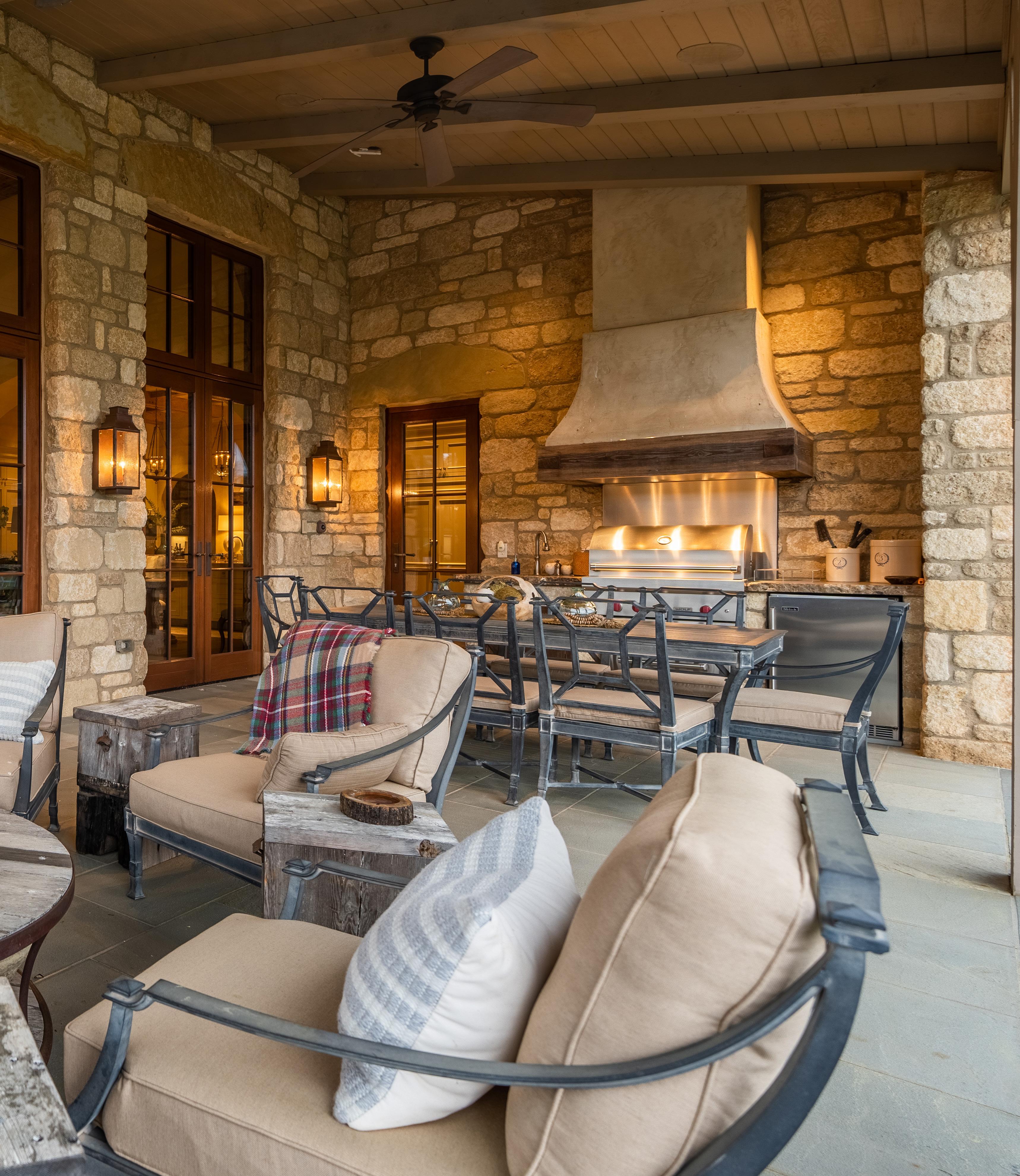 The chef’s kitchen has an elegant farmhouse feel, with a coffered ceiling and vent hood made from Longleaf pine beams salvaged from the historic Clifton Mill in Spartanburg. Travertine stone countertops, along with a custom Lacanche range and a Sub-Zero refrigerator, create the perfect space for the most discerning chef. An adjacent butler’s pantry offers abundant storage, a Sub-Zero freezer, additional sink and dishwasher and laundry facilities. A chic wet bar is tucked between the kitchen and great room.