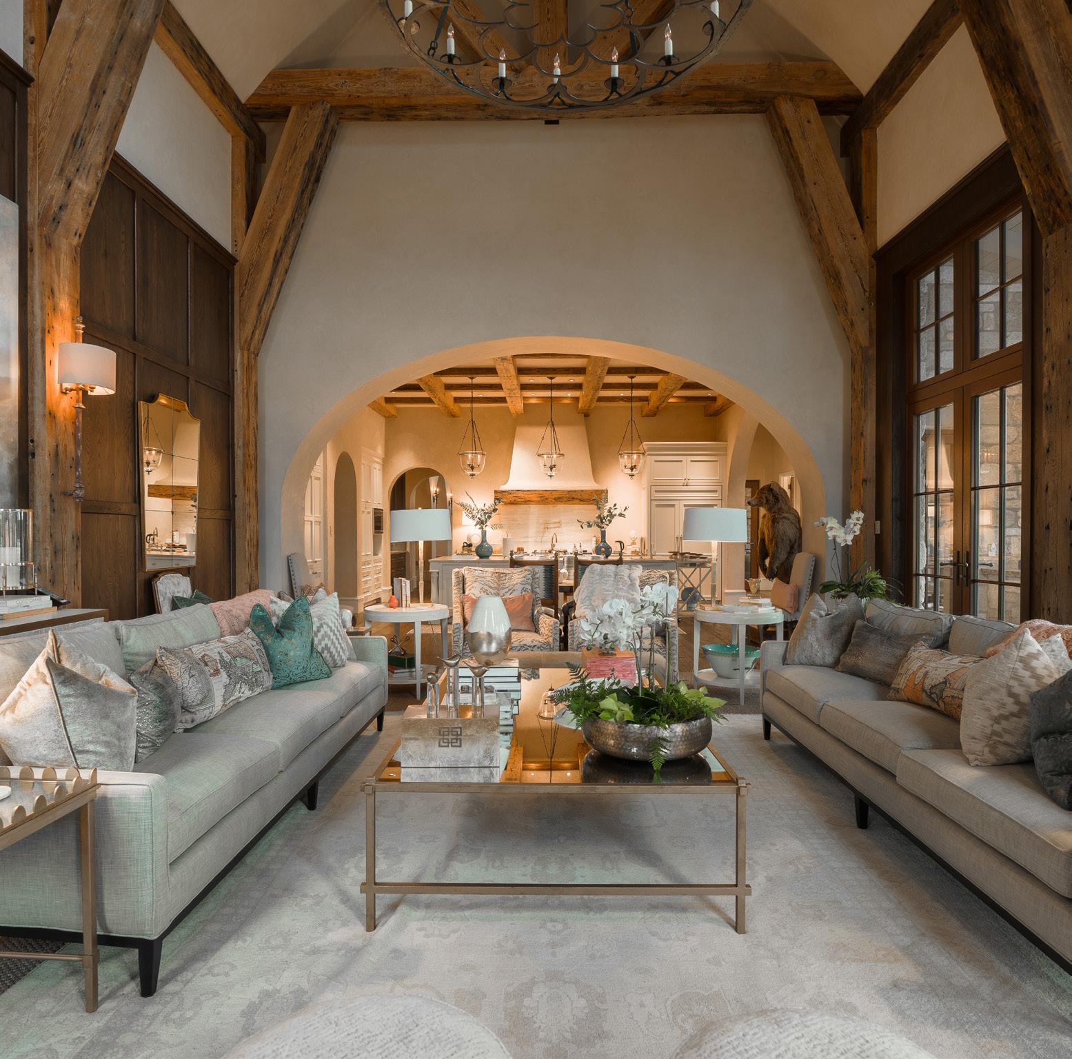 A pair of matching mirrors – crafted from 16th Century French headboards – are mounted above the enormous Italian limestone fireplaces that flank either side of the home’s great room – their chimneys reaching into the barrel-vaulted ceiling punctuated by curved wooden beams. The fireplaces are in a modified Rumford style, taller and bigger than the original to fit the scale of room and provide better heating.