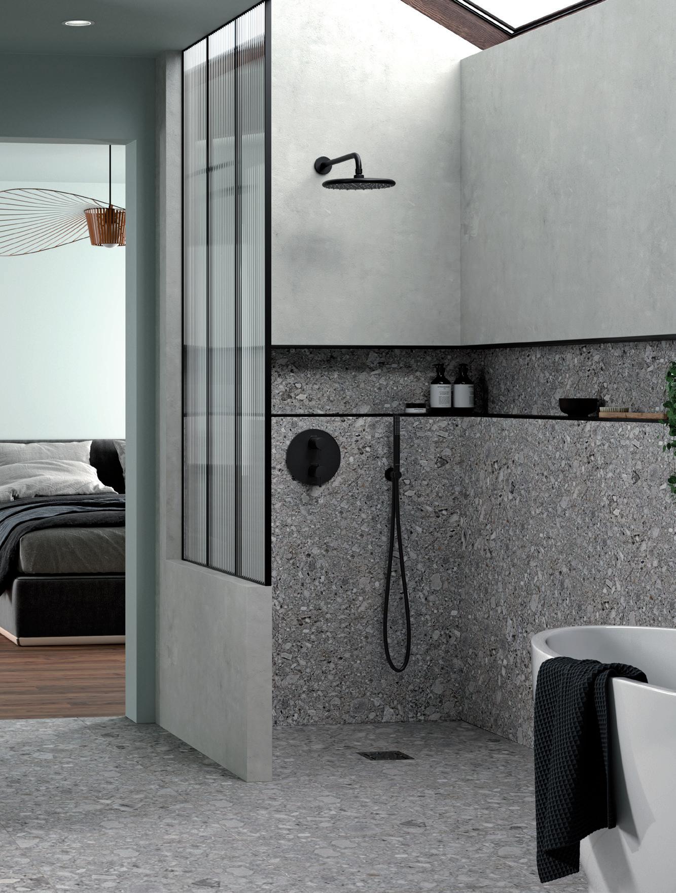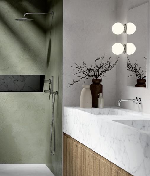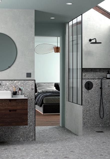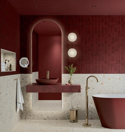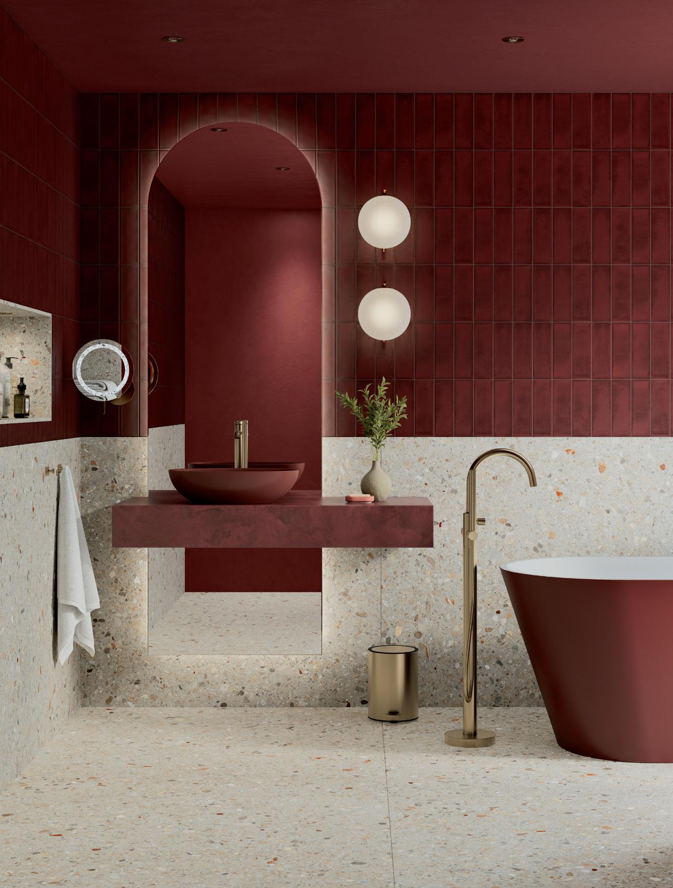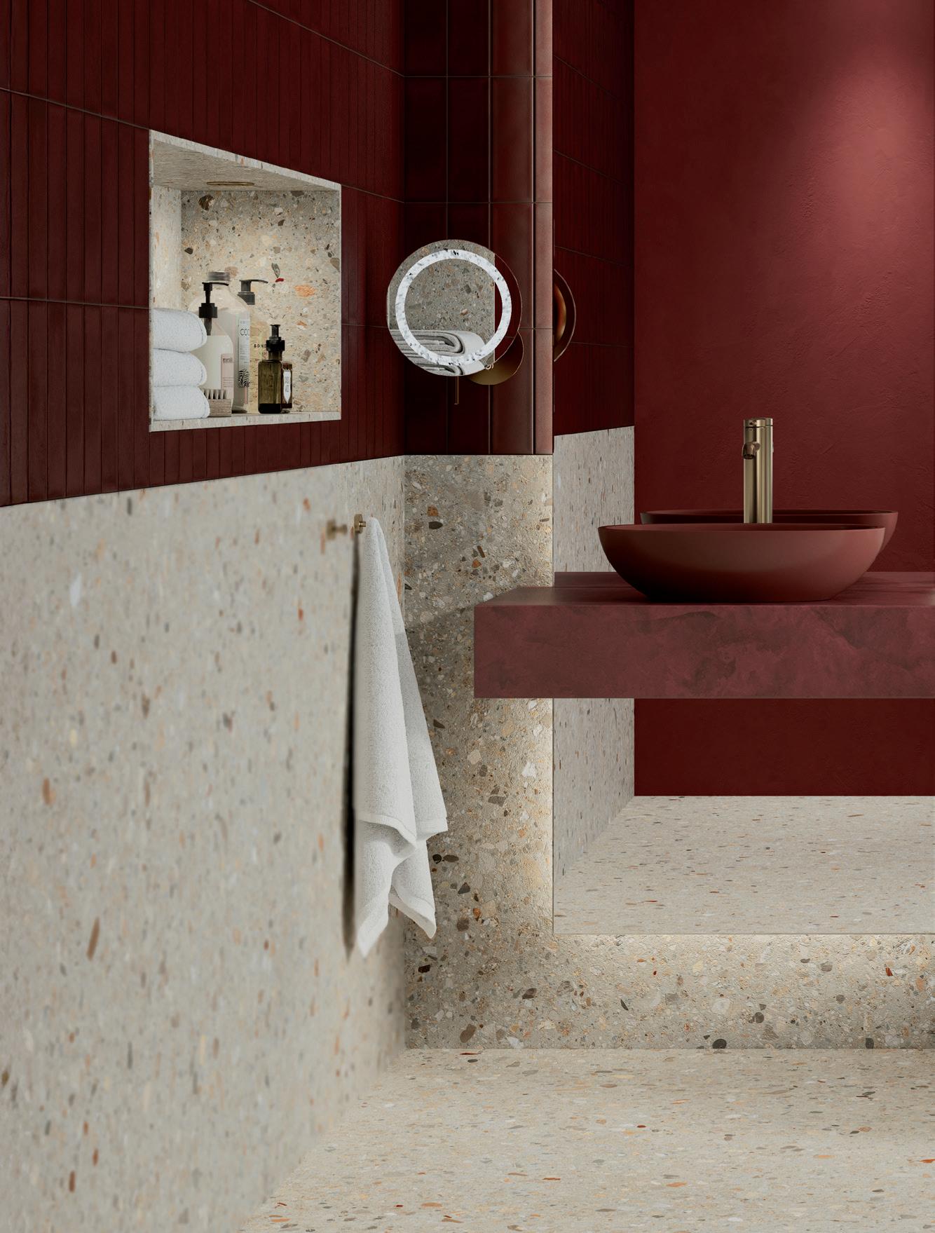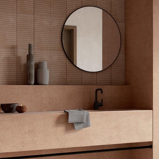 Mix raw materials such as ceramic tiles and natural stone, like limestone and travertine, with elegant and functional designer pieces for the perfect balance.