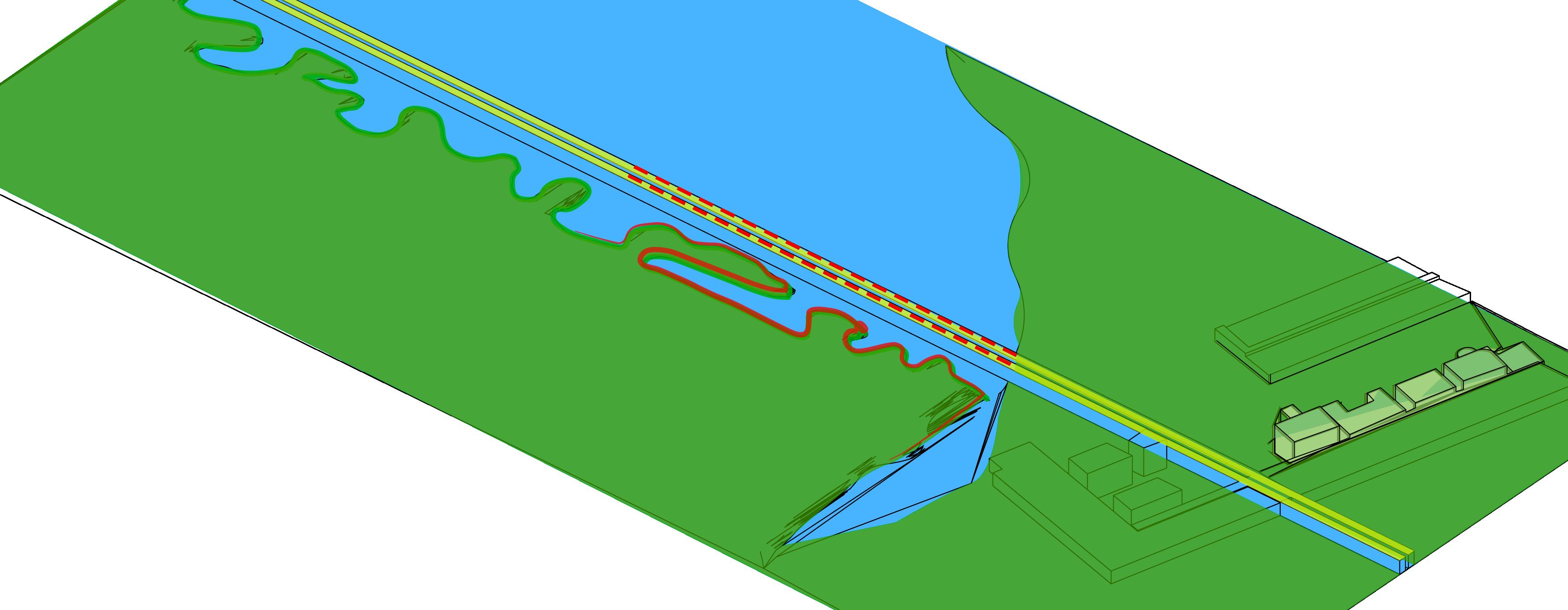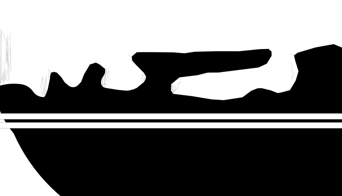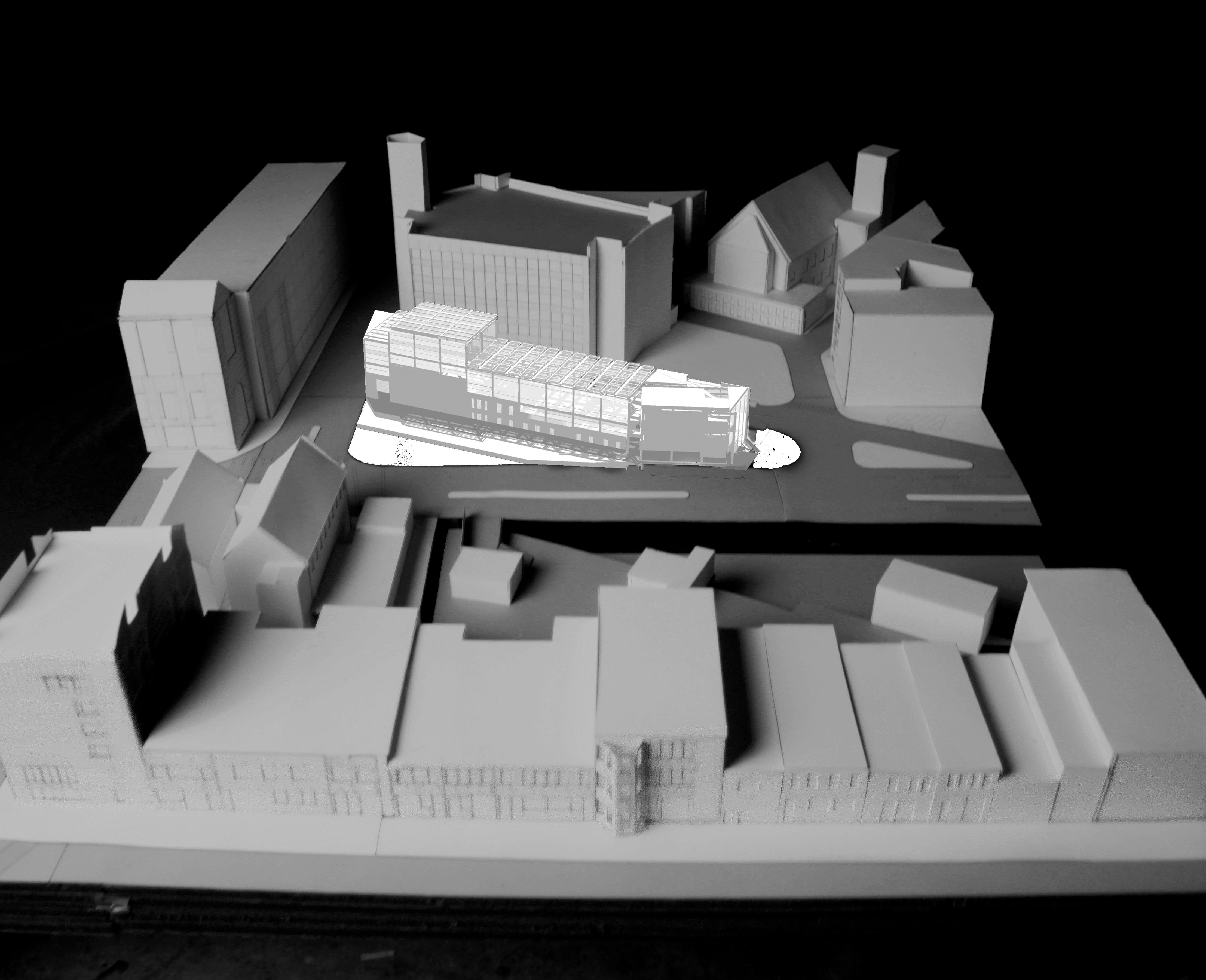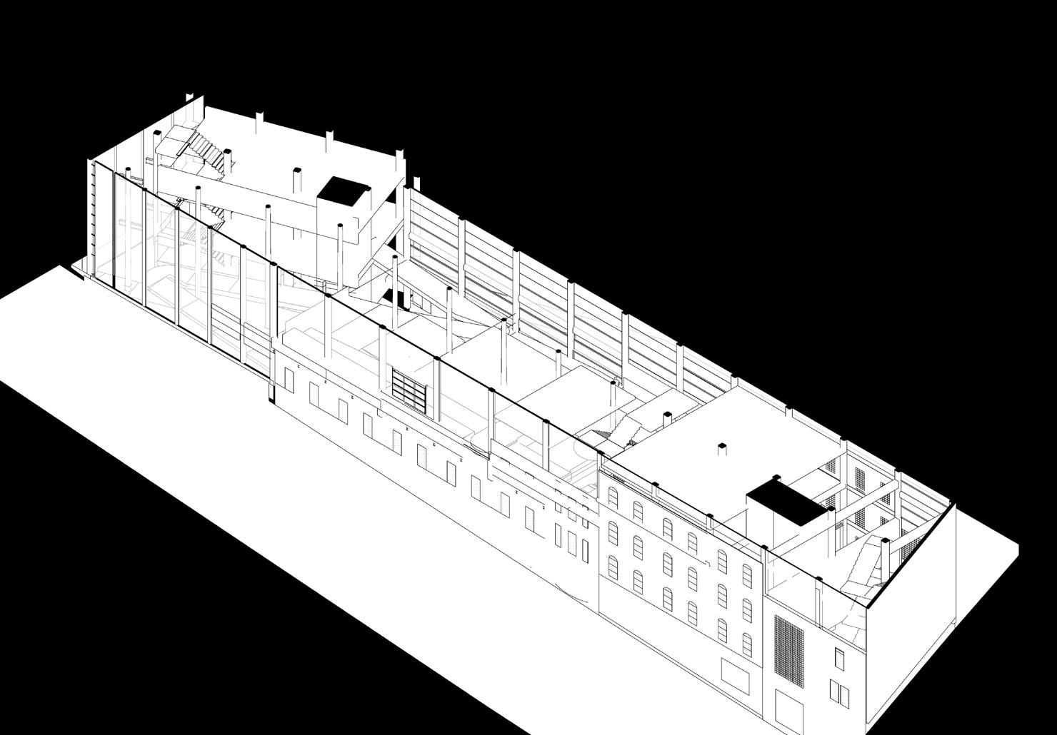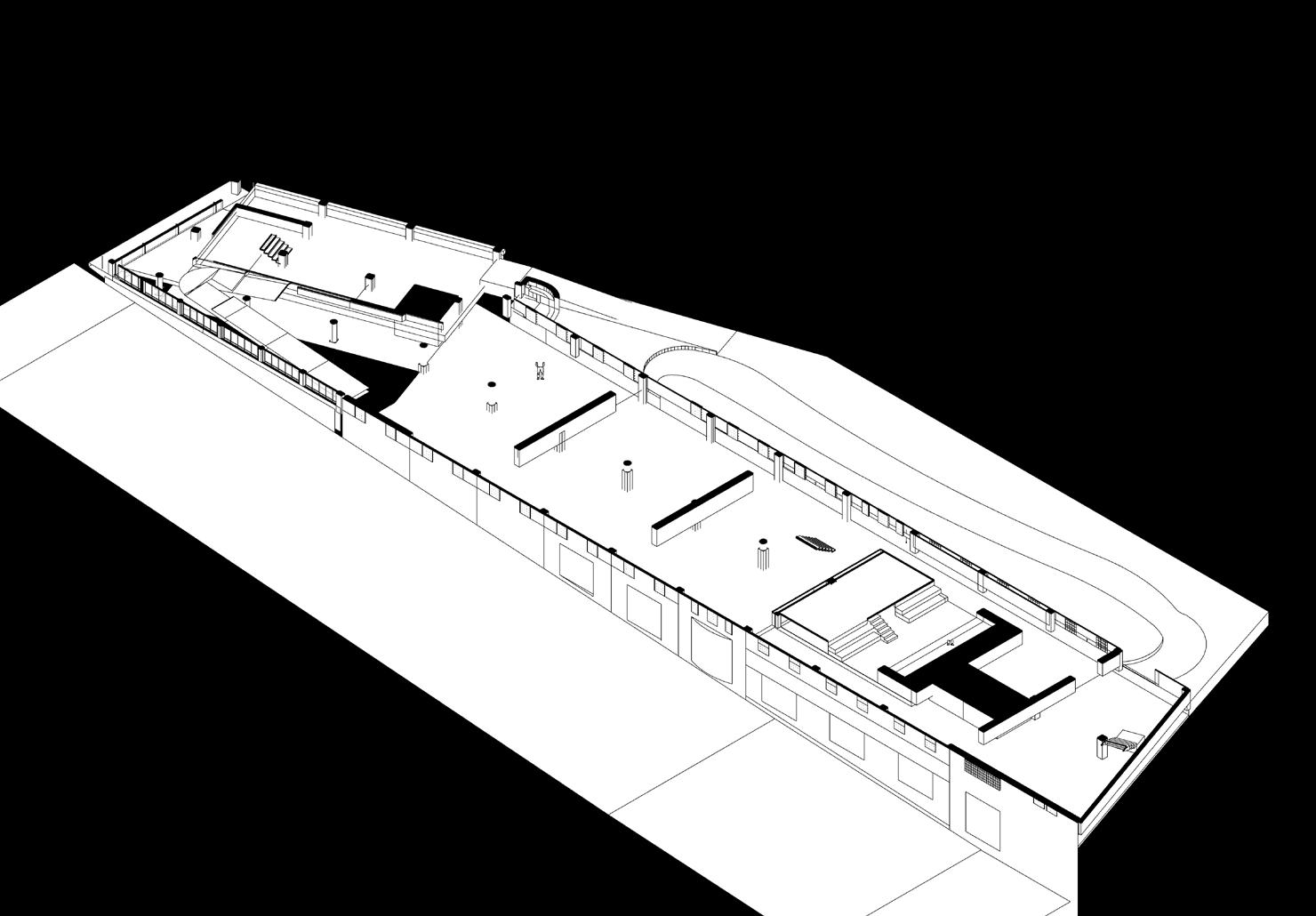 The small building that can be seen is maps as the joint between the pieces of the broken row is endowed with purpose as the locus of the break. In my final design this space is a full building height ceiling and serves as thebeginning of the ramp system that leads to the mezzanine.
