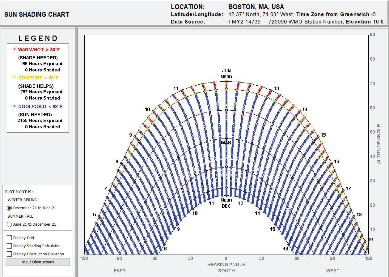 During the winter and spring months sun is needed for thermal heat gain nearly 90 percent of the hours. Boston is a cold climate and sun is helpful to maintain comfortable heat with in the building.