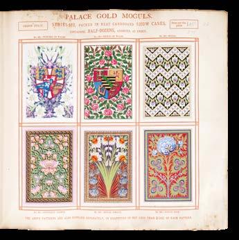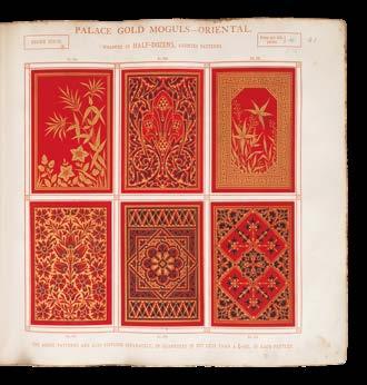 In 1844, De La Rue had employed the architect and designer Owen Jones to design the backs of his cards. His distinctive motifs took inspiration from Chinese, Indian, and Islamic art, often botanical or geometric in composition. Charles Dickens praised, in an article on playing cards in Household Words, the ‘talented artists’ used by De La Rue. With Jones having died in 1874, it is unclear whether the designs in the present catalogue are his work. They do, however, very much reflect his style.