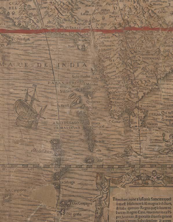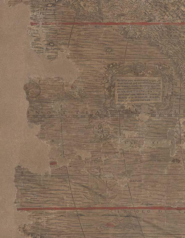 Throughout the map is a series of legends that refer to the distant lands of southeast Asia, the Moluccas, Tabrobana, the Philippines, and the riches to be found there; as well as the Americas and South Africa.