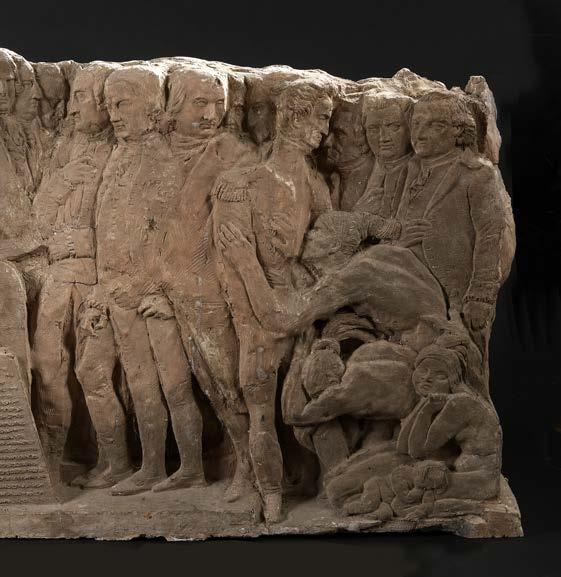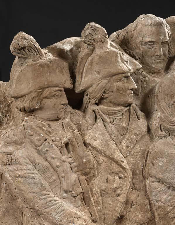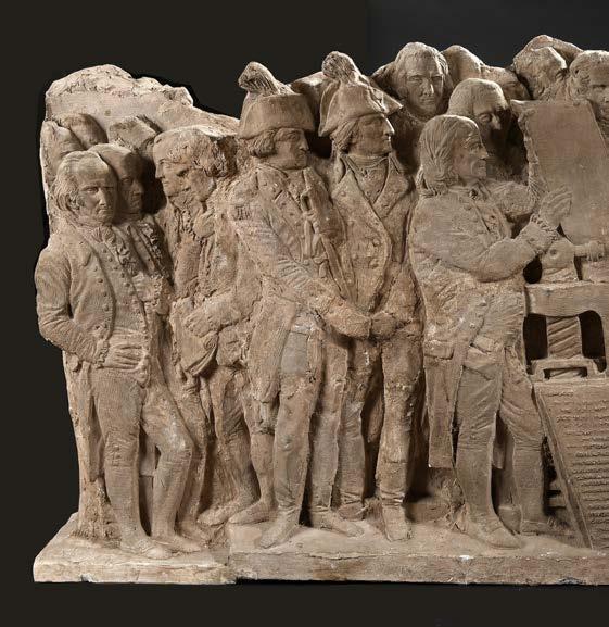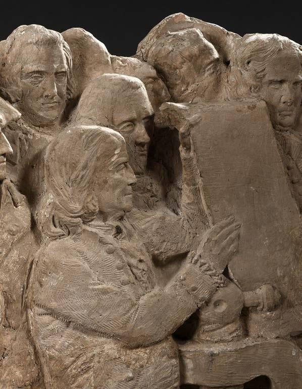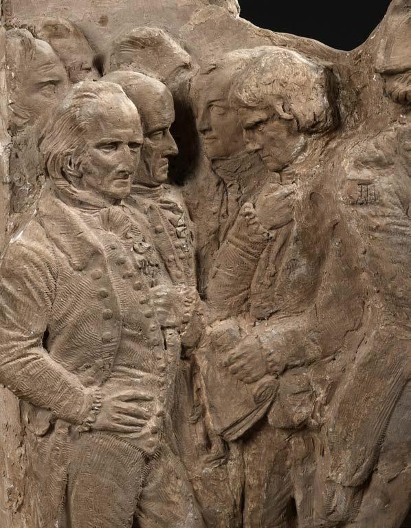 ‘Notre Dame de Paris’, and a scene in which Frollo holds up a book with one hand, points to the cathedral with the other, and predicts the victory of Democracy over Theocracy: “this will kill that”. The maquette appears to be one of David d’Angers’s earliest renderings of the scene that he had in mind for the finished frieze. It differs from that kept at the David D’Angers museum in Angers, by the absence of the background in the final version, where the names of the historical figures appear. The portraits of Thomas Nelson and John Morton are also absent, and some figures, such as those of John Adams, are less detailed, as are some other aspects of the whole, such as clothing. The heart of the composition, the printing of the Declaration of Independence proudly displayed by Franklin, remains empty.
