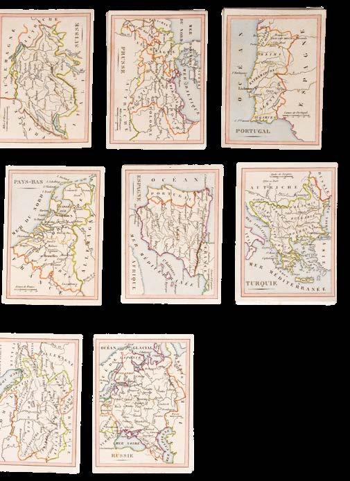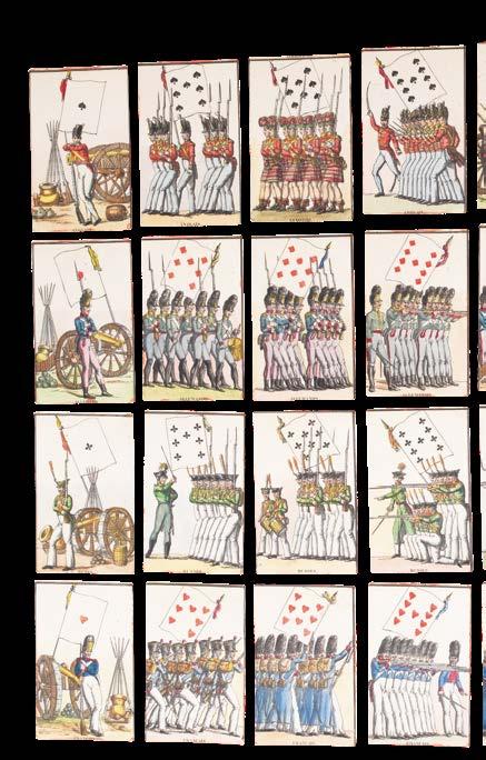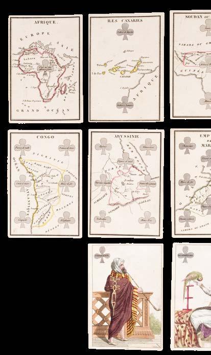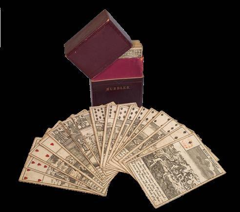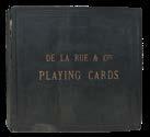 Thomas De La Rue (1793-1866) transformed the production of playing cards in Britain. Born in Guernsey, he pursued careers as a leather-embosser, bookbinder, and straw-hat manufacturer, before moving into playing cards in 1828. Granted a patent in 1831 for the use of letter-press printing in playing card manufacture, he moved the process away from wood-block printing, allowing the rapid production of cheap decks (by the mid-19th c., 265,000 decks per year) with attractive designs on the backs – as the present catalogue illustrates.