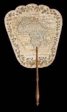 Handheld fire screen, engraved map with with original hand-colour, French text to verso, with wooden handle.