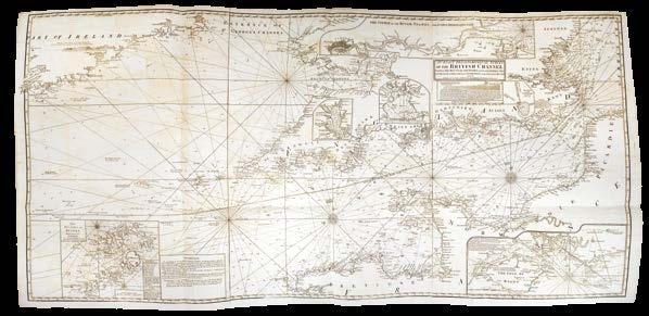 Large folio (540 by 385mm). 24 engraved charts and one tide table, all numbered in ink stencil, four of which folding, 18 double-page, and two single-page, the final engraving being “A new and correct tidetable for the British Channel” printed on a single sheet with right-hand margin folded complete with one moving dial, some light offsetting throughout; contemporary half calf over marbled-paper covered boards, rebacked and recornered to style.
