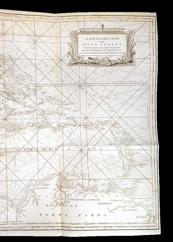 These three charts contain the earliest imprint of Laurie and Whittle, 12 May 1794, probably the day they became the new proprietors of Robert Sayer’s business (see Fisher, p.61). All three were published earlier as part of Thomas Jeffreys’ The Atlantic Pilot by Laurie and Whittle in 1794 (see Christie’s New York, sale 8536, 8 November 1996, lot 81), but they are in fact much older in origin. The first chart, “An Accurate Draught of the Gulph-Passage from Jamaica with the West end of Cuba, & c.” has a note on the Florida peninsula that reads “Published by the Author May 20 1761”. Sayer’s practice of creating charts “done up in a portable manner” (quoted by Fisher, p.57) but without text, was therefore adopted by his successors, ostensibly offering a different, more specialized product. While extremely flexible, and a profitable way to publish, it did lead to charges that these charts were out of date and unreliable in area where accuracy was of prime importance. In fact, these charts were already obsolete by the time of publication, as newer hydrographic data emerged from the Napoleonic Wars.