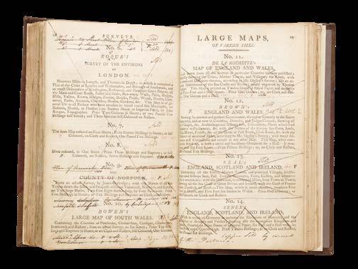 The engraved trade of map and chart seller James Heskett on the front pastedown is interesting as it shows that Sayer was selling not only directly, but also through other dealers. Heskett of 13 Sweetings Alley, Royal Exchange, describes himself as: “Map, Print & Chart-Seller. Prints & Drawings neatly Framed & Glazed. Maps Beautifully Colourd [sic] and adapted for Librarys [sic] or Travelling. Globes & Mathematical Instruments, Books, Gunters-scales, Compasses, Pencils and India Ink. Charts properly fited [sic] up for Navigation. Drawing Books, & Reeve’s Superfine Colours. Atlases, East & West India Pilots.”