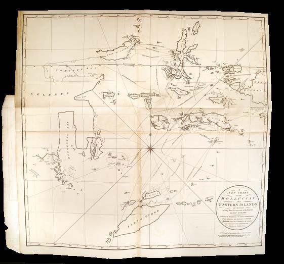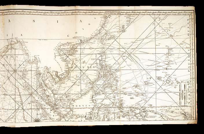 The present work is intriguing, as the double-page charts are mounted on stubs that are themselves made from old versions of Dunn’s charts. It is also extremely rare: no copies can be traced at auction (RBH); the only institutional copies that can be traced are those in the London Library, Danish Royal Library, and the Huntington Library. The London Library’s example is bound with the same author’s 24-pages, small quarto accompanying text, ‘The navigator’s guide to the Oriental or India seas, or, The description and use of a variation chart of the magnetic needle’, dated 1775.